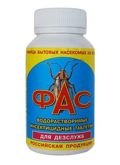 Lijek za suzbijanje nekoliko vrsta insekata predstavljen je u obliku posebnih tableta koje se moraju otopiti u tekućini. "Fas" je insekticidni agens koji ne samo da štiti prostor od insekata, već i dugotrajno popravlja rezultat. Lijek je prilično ekonomičan, tako da je jedno pakiranje dovoljno dugo. Koristi se u zatvorenom prostoru, na kopnu. Jedno pakiranje sadrži 100 tableta. Oni izvrsno rade s kukcima i drugim štetočinama (npr. Koloradski krumpirski žohari, žohari). Tijekom obrade važno je evakuirati kućne ljubimce iz kućanstva.