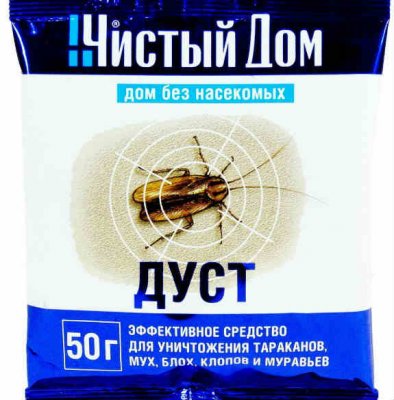 Insekticidno sredstvo "Clean House" ima praškastu konzistenciju, dostupno je u pakiranjima od 50 g. Jedno pakiranje je predviđeno za površinsku obradu od 10 m2. Lijek se razlikuje od sličnog načina uporabe. Ne mora se razrjeđivati s tekućinom, već se mora koristiti u izvornom obliku. Zbog toga, bugovi umiru iu udaljenim mjestima, jer je prah lako zaspati apsolutno svugdje. Kao i kod svih insekticida, važno je poduzeti mjere opreza pri korištenju ove prašine. U vrijeme liječenja treba ukloniti životinje, hranu, higijenske proizvode, prozore kako bi ostali otvoreni i izbjegavajte kontakt s praškom na koži.