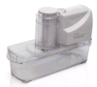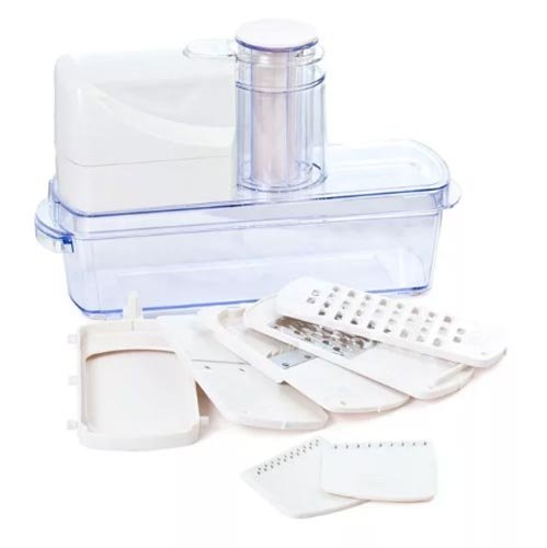 Elegantno tijelo ovog električnog rezača povrća izrađeno je od bijele plastike s prozirnim poklopcem na vrhu. Kroz njega korisnik može vidjeti sve procese koji se događaju unutar uređaja. Takva sigurnost omogućuje da čak i mala djeca sudjeluju u procesu kuhanja - rizik od ozljede je minimalan. Sustav omogućuje sjeckanje povrća na kockice, slamke ili rezanje na kriške. Proizvođač nudi uroniti proizvode u lijevak i pomoći im da se zgnječe pomoću priložene ručke.