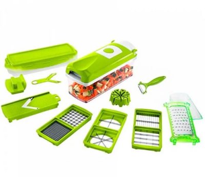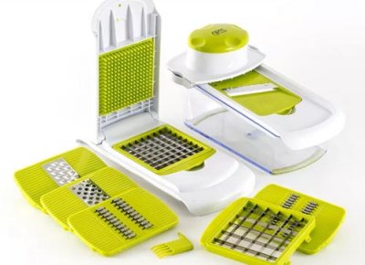 Nicer Dicer Plus pomogao je da se sa svojom svestranošću stigne do rezača povrća TOP - jednako dobro radi s mesom i sirom, kao is povrćem ili voćem. Zbog prisutnosti nekoliko mlaznica, proizvodima se može dati vrlo različit oblik - slamke, kocke, krugovi, klinovi. Osim toga, proizvođač nudi spremnik za spremanje rezanja i alat za čišćenje uređaja.