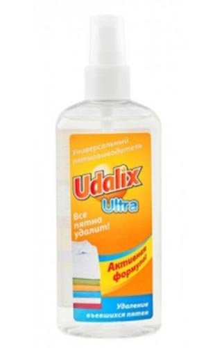 Univerzalni odstranjivač mrlja Udalix dizajniran je za uklanjanje i svježih i ukorijenjenih mrlja od masti, kave, vina i drugih problematičnih kontaminanata. Važna prednost alata je mogućnost korištenja za različite površine: tkanine, posteljina, namještaj, unutrašnjost automobila itd. Dostupno u nekoliko svezaka odjednom, od kojih se najmanji može uzorkovati. Recenzije kupaca ukazuju na visoku učinkovitost, praktičnu primjenu i trenutačno djelovanje. Mjesta koja su se nedavno pojavila uklonjena su prvi put, ali za stare će biti potrebna ponovna uporaba. Alat je vrlo popularan zbog osjetljivog utjecaja i potpunog očuvanja boje odjeće prije pranja. Glavna prednost Udalix Ultra je njegova niska cijena u kombinaciji s visokom kvalitetom.