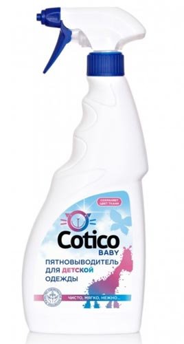 Sljedeći odstranjivač mrlja bit će od velike pomoći za sve roditelje. Aktivno prodire u zagađenje, brzo ga se oslobađa. Posebno dizajnirana formula prikladna za najmlađu djecu, jer ne uzrokuje alergijsku reakciju. Ne sadrži štetne kemikalije, pa se može smatrati apsolutno sigurnim. Glavna značajka sredstva za uklanjanje mrlja Cotico Baby je njegov oblik. Izrađuje se u obliku tekućine s posebnim sprejom koji pruža najprikladniju primjenu za stvari. Pogodan za bijele, obojene tkanine, a također je dopušten za uporabu pri niskim temperaturama. Još jedna važna prednost je da alat uklanja mrlje ne samo od odjeće, nego i od igračaka, namještaja itd. Cotico Baby ima mnogo pozitivnih recenzija.