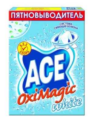 Također je popularan za uklanjanje mrlja na domaćem tržištu - Ace Oxi Magic. Zahvaljujući pristupačnoj cijeni i izvrsnim rezultatima u isto vrijeme, zauzima vodeću poziciju na vrhu ljestvice Kupci ostavljaju samo pozitivne povratne informacije. Ovaj alat za uklanjanje mrlja radi čak i na niskim temperaturama i dizajniran je za bilo kakvu vrstu pranja. Vrlo je jednostavan za upotrebu - samo pomiješajte malu količinu asa s običnim prahom. Nakon prvog pranja, odjeća postaje primjetno svjetlija i čišća. Uz redovitu uporabu, stvari izgledaju novije, a njihove izvorne boje su sačuvane. Proizvođač nudi dvije vrste alata koje možete izabrati za bijelu odjeću ili odjeću u boji. Brzo zbrinjavanje čak i tvrdokornih mrlja glavna je značajka ovog sredstva za uklanjanje mrlja.