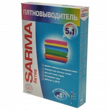 Jeftin i kvalitetan odstranjivač mrlja od poznate tvrtke "Neva Cosmetics" ima niz prednosti u odnosu na druge slične proizvode. Zahvaljujući petokomponentnom kompleksu visoko učinkovitih bioloških enzima, Sarma Active 5 u 1 može se nositi sa složenim vrstama zagađenja čak iu hladnoj vodi. Temperatura aktivacije praha je samo 30 ° C, što omogućuje uspješno korištenje ne samo kod kuće, nego iu manje ugodnim uvjetima (na izletima, šetnjama, ljetnikovcu). Sredstvo za uklanjanje mrlja pogodno je za bijelu i obojenu posteljinu, može obraditi većinu vrsta tkanina (osim prirodne svile i vune) bez opasnosti od oštećenja. Ima antibakterijsko djelovanje.