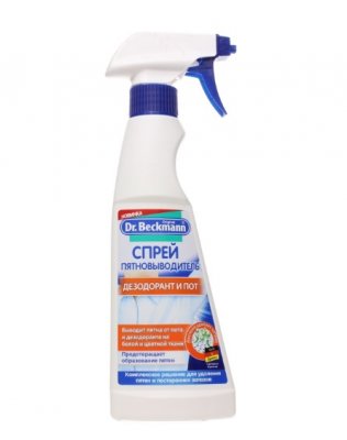 Bjelilo u obliku spreja je vrlo govorno ime "Dezodorans i znoj", dizajnirano da odmah označi opseg posla. Proizvod se lako nanosi, brzo prodire u tkaninu, eliminira žutu boju i neugodan miris. Čak i uz ponovnu upotrebu Dr. Beckmann ne "pojede" boju materijala, nego djeluje lokalno na mrlji. Kompozicija sredstva za uklanjanje mrlja prošla je stručna dermatološka istraživanja, nakon čega je utvrđeno da je potpuno sigurna za ljudsku kožu. Uz poštivanje osnovnih principa pranja i dovoljno obilno ispiranje, tekućinu mogu koristiti čak i ljudi skloni alergijskim reakcijama na sintetske deterdžente. Volumen boce s uklonjivim sprejom - 250 ml.