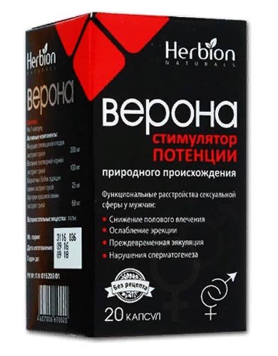 Želatinozne kapsule "Verona" sadrže ekstrakt zimskih trešanja, svrbežnu sluz, lijepu argriju i pucanje Yagoretsa. Lijek inhibira asteno-neurotične reakcije, što pomaže povećati trajanje spolnog odnosa, povećati erekciju i seksualnu želju. Sastav biljaka ima pozitivan učinak na spermatogenezu: povećava se volumen spermija, povećava se koncentracija spermatozoida i povećava njihova mobilnost.