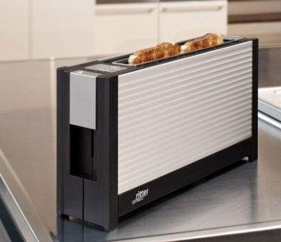 Ritter Volcano 3 je dostojan natjecatelj luksuzne kategorije, ima izvrsne karakteristike i atraktivan izgled. Ovaj toster je dobio nagradu za najnižu potrošnju energije i visoku sigurnost. Tijelo je izrađeno od toplinski izolacijskog materijala, a prednja ploča je izrađena od aluminija. Dolazi s prikladnom mlaznicom za pecivo. Korisnik podešava temperaturu na ploči, LED pokazuje stupanj spremnosti. Od dodatnih značajki mogu se razlikovati odmrzavanje i grijanje, zdravice se točno uklapaju i prže isto. Ako se kriška zaglavi, uređaj će se isključiti.Posudu za mrvice možete prati u perilici posuđa.