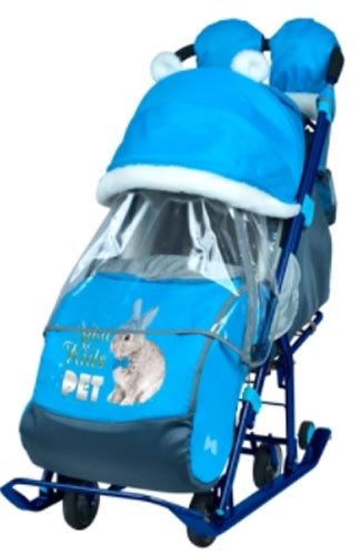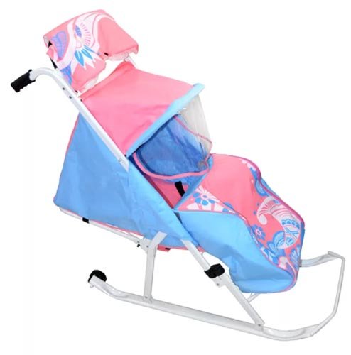 Za sigurnost kretanja odgovoran je pojas s pet točaka, široko sjedalo i podesivi oslonac za noge. Dodatnu udobnost pružaju madrac i krznene rukavice. Sanjka je opremljena gumiranim kotačima. Plosnati široki trkači (4 cm) lagano klize po snijegu. Pomoću posebnog mehanizma možete promijeniti položaj s vodilica na kotače. Dizajn modela je relevantan za djecu od 1 do 3 godine. Kolica imaju svijetli uzorak i vizir s ukrasnim ušima.
