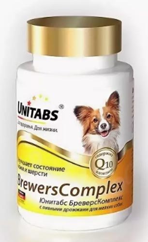 U osnovi Unitabs Brevers Complex koristi se za poboljšanje stanja kose i kože pasa. Cink pomaže aktivnom rastu kose, selen sprječava njihov gubitak. Vitamini E i A čine kožu glatkom i zdravom. Pivski kvasac smanjuje molting, daje vunu sjaj i svilenkastost. Bakar mu daje svjetlinu. Vitamin C igra ulogu antioksidansa, a koenzim Q10 povećava imunitet, podupire kardiovaskularni sustav, jača desni i zube.