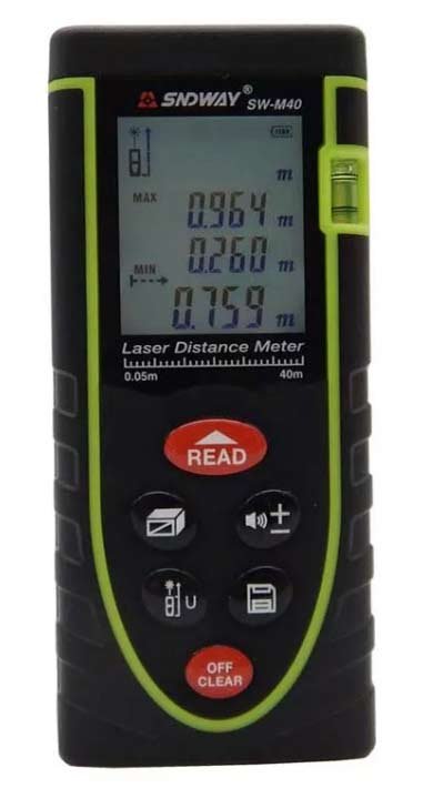 Uređaj za mjerenje dometa SNDWAY SW-M40 može mjeriti duljine ravnih linija do 40 metara s maksimalnom pogreškom od 2 mm. Osim toga, njima je lako izvršiti potrebne aritmetičke izračune, odrediti visinu teško dostupnih objekata (koristeći Pitagorejsku formulu) i pronaći min i max u podatkovnom polju. Zbog prisutnosti osvjetljenja, proračuni se mogu provesti čak i pri slabom osvjetljenju, a velike gumirane gumbe dodatno će pojednostaviti proces.