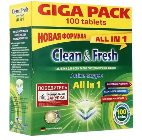Sredstvo njemačke tvrtke Clean & Fresh je tableta s posebnom formulom koja im omogućuje da se koristi za pranje bilo kojeg posuđa: staklo, srebro, nehrđajući čelik, porculan. Kapsule se sastoje od nekoliko slojeva, od kojih svaki obavlja svoj zadatak. Zelena daje aromu i štiti staklene proizvode od oštećenja, bijela sprječava razmjere i naslage na samom stroju, a plava pouzdano pere posuđe. Enzimi koji su uključeni u sastav daju sjaj i sjaj. Ocjene kupaca pokazuju izvrsne rezultate nakon primjene. Sredstva imaju najjače zagađenje, uključujući i mast. Važna razlika Clean & Fresh je svestranost.Tablete ne samo nježno i istodobno učinkovito čiste posuđe, već i brinu o opremi.