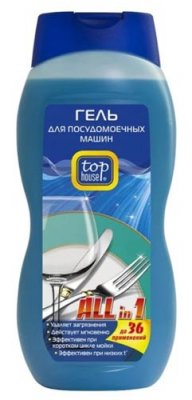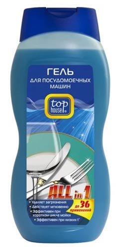 Top House Sve u 1 zasluženo postaje najbolje u kategoriji gel proizvoda za perilice posuđa, a to je cijev od 720 ml, koja traje dugo vremena. Za uporabu, morate uložiti malu količinu novca u poseban odjeljak Trenutno čisti i sprema jela od neugodnih mirisa. Njemački proizvođač proizvodi ovaj gel, uzimajući u obzir značajke modernih perilica posuđa i zahtjeve kupaca. Kompletno odlaganje prljavštine od Top House moguće je čak i kratkim ciklusom. Posebna formula sprječava stvaranje kamenca i također pomaže u smanjenju potrošnje vode. Za razliku od većine gelova, ovaj proizvod ima ulogu soli koja omekšava vodu. Druga važna prednost je mogućnost korištenja na niskim temperaturama.
