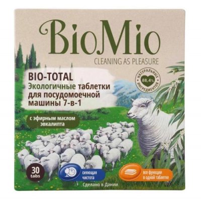 Sljedeći alat je primjer izvrsne kvalitete i apsolutne sigurnosti. Ne sadrži tvari štetne za tijelo, omekšava vodu, ublažava jaka zagađenja i neugodan miris. Sudeći po recenzijama, nakon primjene BioMio jela imaju prekrasan sjaj. Ulje eukaliptusa daje ugodnu laganu aromu. Jedna tableta dovoljna je za veliku količinu prljavog posuđa, neki kupci ih čak dijele na nekoliko dijelova. To čini alat vrlo ekonomičnim. Svaka kapsula zaštićena je biorazgradivom ambalažom, što je vrlo pogodno za korištenje. Pogodno za pranje posuđa od nehrđajućeg čelika ili stakla, namijenjeno za niske temperature.