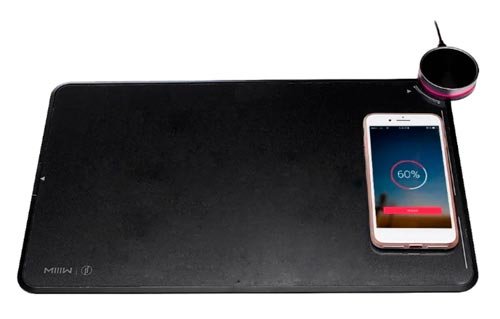 Otvorite kategoriju neobičnog bežičnog punjača ... miša. Da, čitaš to pravo. Našu pažnju privukla je tepih iz popularne Xiaomi. Zašto nered stol s posebnim naknade, ako možete kombinirati dva korisna uređaja u jednom uređaju? Dizajn je vrlo jednostavan - plastična platforma za miša dimenzija 420x260 mm, kontrolna perilica i bez ometajućih slika. Upravljački kotačić je dizajniran za podešavanje glasnoće zvuka na računalu i upravljanje RGB-pozadinskim osvjetljenjem. Osnova tepiha je izrađena od aluminija - nema sumnje u pouzdanost. Dno je prekriveno poliuretanom koji ne kliže.
