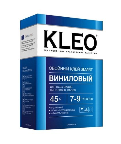 Kleo Smart Vinyl ljepilo ima dobru reputaciju među poštovanim završiocima i vlasnicima početnika. Osnova proizvoda je modificirani škrob, dodaje se baktericidna tvar. Zahvaljujući ovoj formuli, ljepilo drži najteže vinilne tapete za vrijeme rada i dodatno sprječava pojavu gljivica u vlažnim područjima. Jedna kutija od 150 grama dovoljna je za pokrivanje površine od 45 četvornih metara. metara, što je jednako 7-9 role role. Međutim, na temelju bez prethodne pripreme (kitanje, premazivanje), potrošnja ljepila može biti veća.