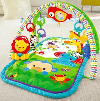 Proizvođač Fisher-Price - jedan od najpopularnijih u svijetu. Ona proizvodi edukativne igračke i pribor za djecu, među kojima posebno mjesto zauzima tepih „Prijatelji iz prašume“. To se sigurno može nazvati multifunkcionalnim gaming centrom, koji će se svidjeti svakom djetetu.Opremljen je glazbenim elementom u obliku lavljeg mladunca s dva načina rada i kontinuiranom igrom u trajanju od 10 minuta, zveckanjem, plastičnim likovima, zubima. Svijetle boje doprinose razvoju percepcije boja. Nakon što dijete prestane zauzimati prostirku, iz nje će biti moguće isključiti zanimljive igračke.