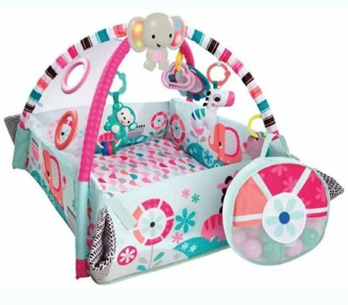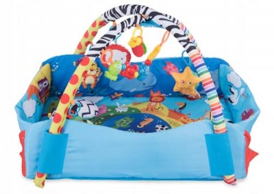 Na svakoj strani nalaze se sigurni lukovi na kojima visi igračka. Djeca će voljeti lijepe boje, zvukove i taktilne učinke. Pomažu u razvoju finih motoričkih sposobnosti, motoričke koordinacije i poboljšanja vida. Sve zvečke su na vidiku i lako dostupne. Tvrtka preporučuje počevši od 6 mjeseci. Proizvodnja se provodi uz pomoć sigurnih i kvalitetnih materijala koji osiguravaju jednostavnost i jednostavnost korištenja. Za lakše skladištenje nalazi se sklopiva vreća.