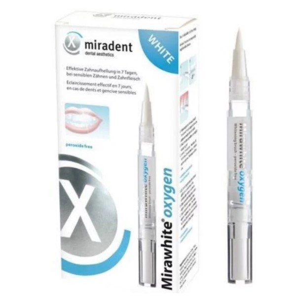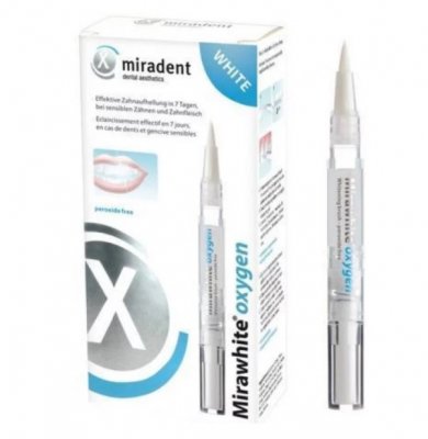 Olovka-gel Mirawhite njemačkog brenda Miradent nije abrazivna, što ga razlikuje od drugih sredstava za izbjeljivanje zubi. Njegovo djelovanje temelji se na oksidacijskoj sposobnosti ugljikovodika sadržanih u kompleksu da smanji pigmentaciju, što pridonosi blagom osvjetljavanju cakline za najmanje 2 tona. Osim toga, lijek smanjuje broj patogenih bakterija u usnoj šupljini, čime doprinosi prevenciji karijesa. Radi lakšeg korištenja, gel se stavlja u epruvetu s aplikatorom za četkanje, što poboljšava točnost distribucije i kontrolira količinu tvari. Olovka od 1,8 ml ima malu veličinu pa je prikladno nositi je sa sobom i ponijeti na put kako se ne bi zaustavio tijek primjene. Maksimalni rezultat pojavljuje se nakon 7 dana liječenja.