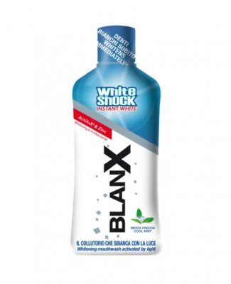 BlanX White Shock tekućina za izbjeljivanje ima trostruki učinak. Regenerator ne samo da osvjetljava caklinu uz redovitu uporabu, već i štiti zube od karijesa i osvježava dah. Zbog visokog sadržaja mineralnih sastojaka prirodnog podrijetla osvježivač je potpuno siguran i odobren je za uporabu djeci od 10 godina. Temelj razvoja je sposobnost aktivnog sastojka Actiluxa da reagira sa sunčevom svjetlošću. Kada se to dogodi, reakcija, zbog koje se molekule pigmenta uništavaju, a zubi se izblijede na mekani, prirodni način. Otopinu mogu sigurno koristiti pacijenti s sustavima zagrada i osobe s preosjetljivošću zubne cakline. White Shock ima ugodan mentolov okus i održava normalnu razinu vlage u desni i sluznici usne šupljine. Volumen boce - 500 ml, cijena - od 700 rubalja.