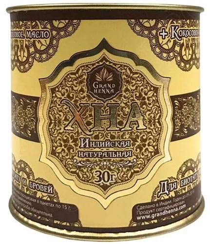Proizvođač je iz Indije Grand Henna proizvodi kanu za obrve sa 100% prirodnim sastavom. Ne sadrži kemikalije ili različite nečistoće. Uključeno je 15 g praha, ulje za uklanjanje sredstava nakon postupka. Nježno vlaži kožu i pruža trajniji učinak. Predstavljen je u obliku prekrasne staklenke u indijskom stilu. Jedno pakiranje je dovoljno dugo.
