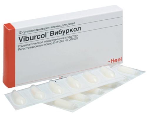 "Viburkol" - lijek složenog djelovanja, proizveden u obliku čepića. Jedan paket sadrži 12 svijeća. Oni ublažavaju grčeve, bolove, upale, imaju snažan sedativni učinak. Dozvoljeno je korištenje od jednog mjeseca starosti kod dojenčadi. Sigurna formula aktivno utječe na simptome pri zubima prvih zuba.