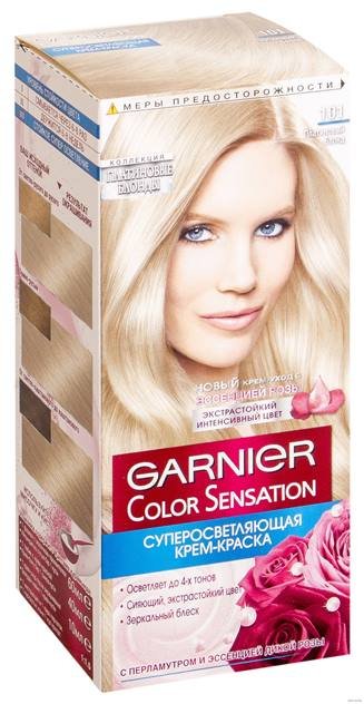 Garnier Color Sensation je linija krema-boja, odlikuje se posebnom izdržljivošću nijansi i njihovim prekrasnim, doslovno sjajnim sjajem. U seriji se nalaze i proizvodi rasvjete raznih plavih tonova: pepeljasti, biserni, ledeni, srebrni, platinasti. Njihova formula uključuje prirodne sastojke, na primjer, ekstrakt divlje ruže, koji ne samo da pozitivno utječe na kosu, već i daje ugodnu aromu smjese tijekom njene primjene.