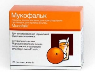 "Mukofalk" iz njemačke tvrtke Dr. Falk Pharma je prirodni laksativ, sposoban zadržati tekućinu u crijevima, što pridonosi oticanju fekalija i potiče proces fiziološkog čišćenja. Dostupan u obliku praha s ugodnim mirisom citrusa, koji se treba otopiti u čaši tople vode i konzumirati u malim gutljajima. Ovisno o težini stanja, tijekom dana možete uzeti 2 do 6 vrećica od po 20 g. Minimalni interval između prijema trebao bi biti od 30 minuta. do 1 sat.