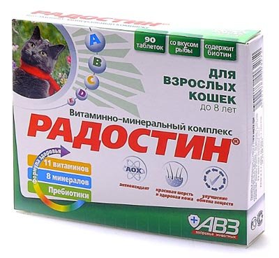 Jedna od vrlo proračunskih opcija za vitaminsko-mineralne komplekse za kućne ljubimce predstavlja brand "Agrovetzashchita", koji proizvodi aditive za životinje svih uzrasta. Svi proizvodi imaju certifikate kvalitete i sigurni su za kućne ljubimce. Lijek za mačke do osam godina smatra se jednim od najpopularnijih i lako dostupnim. U svom sastavu sadrži ne samo makro i mikronutrijente, nego i prebiotike, koji pozitivno djeluju na probavu i imunitet. Brzo dovodi do normalnog metabolizma, kompenzira nedostatak vitamina i odgovoran je za obnovu i održavanje reproduktivne funkcije.