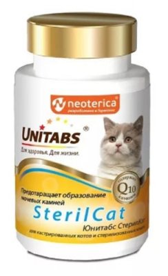 Njemački razvoj, koji aktivno koristi ruska tvrtka Unityabs, jedan je od najpoznatijih među vlasnicima kastriranih i steriliziranih kućnih ljubimaca. Njihov glavni zadatak je spriječiti pojavu kamenja u mokraćnom sustavu, kao i spriječiti pretilost. SterilCat s koenzimom Q10 prikladan je za mačke i mačke svih pasmina. Q10 ubrzava metaboličke procese u tijelu kućnog ljubimca, štiti ga od djelovanja slobodnih radikala, ispunjava stanice kisikom, poboljšava imunitet i usporava starenje. Tablete su pogodne za kućne ljubimce starije od 8 mjeseci.