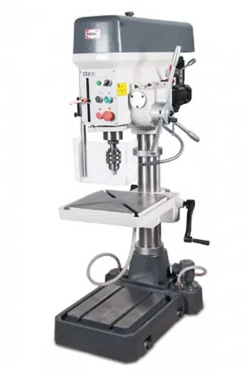 Profesionalni stroj s glatkim (elektroničkim) podešavanjem brzine rotacije ispunjava se dubokim bušenjem čelika i lijevanog željeza (do 20 mm). Ova izvedba osigurava snažan električni motor od 1,1 kW, čija se rotacija prenosi kroz jednožilni remenski pogon. Maksimalni broj okretaja je 2000, a ako je potrebno, može se spustiti na 450. Masivna cijev debelih stijenki (73 mm), duž koje se polazi baza, savršeno prigušuje vibracije, što osigurava visoku preciznost bušenja. Površina radne površine ima podešavanje visine i kuta nagiba, pružajući rješenje za širok raspon zadataka.