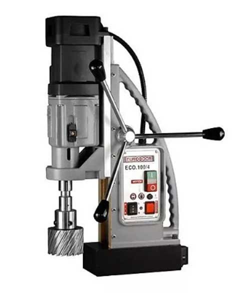 Uređaj može raditi i sa spiralnim svrdlima (do 32 mm) i prstenastim rezačima s maksimalno dopuštenim promjerom od 100 mm. Vreteno tipa "Cone Morse br. 3", dobra rezerva snage (1,9 kW) i pouzdan mjenjač osiguravaju visoku učinkovitost bušenja pri bilo kojoj debljini obratka (do 10 cm). Elektromagnetska montaža omogućuje ugradnju stroja izravno na rad na velikom radnom predmetu, što uvelike proširuje opseg njegove primjene. Osim toga, pomoću stroja za bušenje Euroboor ECO.100 / 4 D, možete navojiti i upustiti.