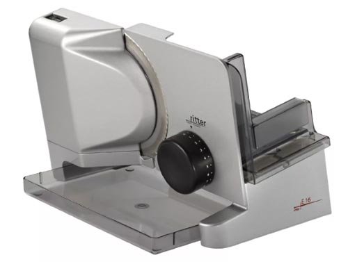 Ritter je jedan od najboljih proizvođača u svom segmentu u Europi i svijetu. Model E16 - električni rezač koji je izrađen od metala. Ima oštri nož s valovitom oštricom promjera 17 cm, koja je iznimno sigurna od rezova zbog posebnog držača i kontrole brzine. Namijenjen je za rezanje praktički svih namirnica (osim tekuće konzistencije). Debljina bloka od 1 do 20 mm. Uređaj za rezanje snage - 65 W, što je dovoljno za dom. Vrijeme kontinuiranog rada je 5 minuta. U industrijskom mjerilu se ne koristi. Prednost modela je prisutnost posude za rezane proizvode. Dobar bonus je dvogodišnje jamstvo proizvođača.