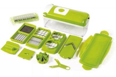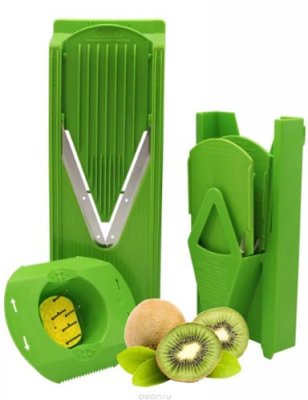 Rezač se sastoji od 3 spremnika: zelene, bijele i prozirne za već izrezane proizvode. Gornji poklopac je čvrsto zatvoren i opremljen gumbom za samočišćenje, proizvođač je razmišljao o sigurnosti, pa su potisni i posebne plastične mlaznice uključene u komplet. Isto tako, uz to su i ljuštači povrća i povrća.