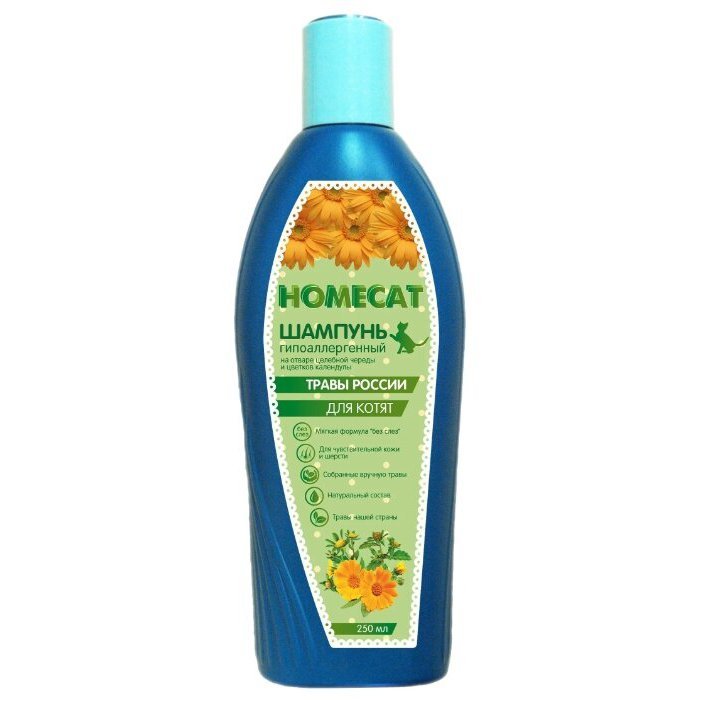 Jeftin, ali učinkovit ljekoviti šampon Homecat idealan je za njegu osjetljive kože i kose mačića. Njegova glavna prednost je mekana formula na izvarku ljekovitog slijeda i cvjetova nevena, koja ne izaziva suze čak ni kada dođe u dodir s očima. Sva bilja koja su dio ovog proizvoda prikupljaju se ručno, dodatno sadrže vitamine C, B i E, kao i makronutrijente.