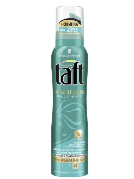 Iznimno jaka pjena za fiksiranje namijenjena je prvenstveno za oblikovanje krhke, tanke i oštećene kose. Prema ocjenama koje koriste ovaj proizvod, TAFT Thick i Curvy ne lijepi kovrče i ne ostavlja masni trag. Uklanja prekomjerno statičko naprezanje, tako da kosa postaje više poslušna i više se ne gura u različitim smjerovima.