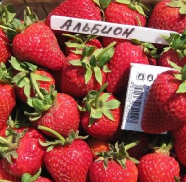 Jedinstvena sorta “Albion” odlikuje se najdužim razdobljem plodonošenja. Možete skupljati ukusne bobice tijekom cijele tople sezone. U isto vrijeme, prosječno oko 2 kilograma jagoda uklanja se iz jednog grma u prosjeku. Kultiviran na Sveučilištu u Kaliforniji prije više od 10 godina. Još jedna važna značajka je povećana otpornost na razne bolesti (antracoza, siva trula itd.). Lako se prevozi na velike udaljenosti. Jedna bobica u težini doseže 60 g. Oblik je okruglog oblika, boja je svijetlo crvena.