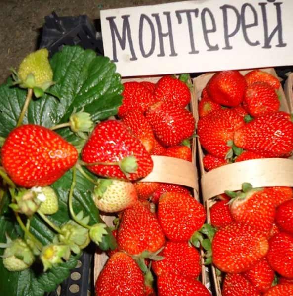 Srodnik sorte "Albion" - kalifornijskog "Monterey" ima vrlo slatke jabuke u obliku čunjeva. Pogodan je za slijetanje i na otvorenom sunčanom mjestu, i pod baldahinom. Na svakom grmu raste velika količina bobičastog voća. Konični oblik s oštrim vrhom, maksimalna težina jagoda - 30 grama.Vrijeme cvatnje na otvorenom tlu počinje u svibnju i traje do jeseni. Žetva se odvija 3-4 puta godišnje. A u loncima može sazrijevati tijekom cijele godine, čak iu gradskom stanu.