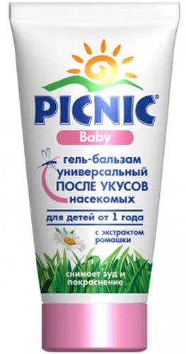 Vrhunski položaj na ljestvici zauzima gel-balzam nakon uboda insekata, kojeg je stvorila popularna domaća marka PICNIC. Posebni laboratorijski testovi smatraju se sigurnim i netoksičnim. Dizajniran za djecu preko 1 godine. Njegovo djelovanje temelji se na umirujućem ekstraktu kamilice. Roditelji napominju da je minuta nakon primjene beba imala neugodan svrab i upalu. Osim toga, gel dodatno brine o osjetljivoj koži za bebe. Djeluje umirujuće i smirujuće.