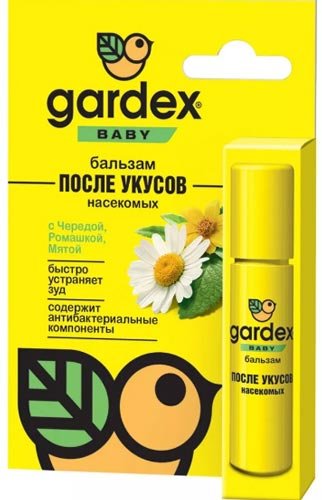 Balz drugog ruskog brenda Gardex beba je predstavljen u obliku valjaka. Vrlo je pogodan za šetnju s djetetom ili za vrijeme putovanja. Kompaktne dimenzije pakiranja omogućuju vam da ih nosite čak iu malom džepu. Namijenjen djeci nakon 12 mjeseci. Ne uzrokuje alergije, jer ne sadrži štetne sastojke. Djelatne tvari ovdje su D-pantenol, ricinusovo ulje, ekstrakti kamilice i sukcesije, eterično ulje paprene metvice itd. Imaju trenutni učinak hlađenja i umiravanja.Dijete odmah svrab, a nakon nekoliko minuta i crvenilo.