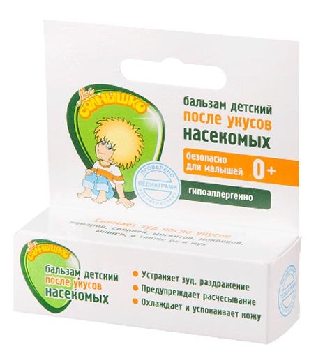 Balzam nakon ugriza komaraca i drugih insekata "Moje sunce" predstavljen je u neobičnom obliku - u obliku olovke. Ima potpuno sigurnu formulu i pogodan je za djecu od rođenja. Kombinira skupinu aktivnih sastojaka, uključujući ekstrakt zrna ječma, ekstrakt ljekovite lješnjaka i bokvice, kao i shea maslac i arganovo ulje. Oni intenzivno olakšavaju svrab, ublažavaju crvenilo i umiruju nadraženu kožu. Ulje metvice u sastavu daje ugodan učinak hlađenja. Nakon nanošenja potrebno je oko 5-10 minuta prije nego nelagoda potpuno nestane. Važna razlika balzama je niska cijena.