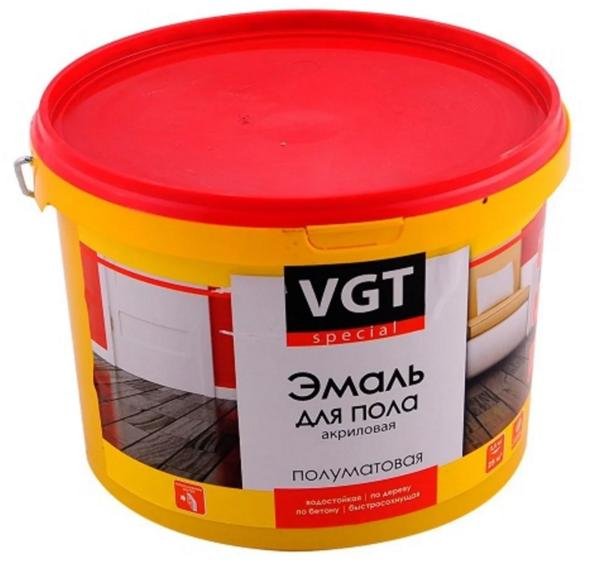 Postoji li jeftin podni emajl koji uopće ne miriše? Ispada, da, a to je akrilna boja emajla iz ruskog branda VGT. Zahvaljujući dobro odabranom sastavu, praktički se ne istroši, odlikuje se visokom otpornošću na svjetlost i vodu i može se koristiti za lakiranje površina od betona, drva, ploča od vlakana, uključujući vrata, namještaj i ostale elemente interijera.Posebnost materijala je niska potrošnja - oko 100 g / m2međutim, preporučuje se dvostruka primjena kako bi se poboljšala dekorativna i izvedbena svojstva.