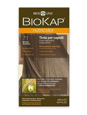 BioKap Nutricolor “Švedski Ash Blonde 7.1” inovativni je alat koji se može preporučiti ženama koje sebi ne postavljaju zadatak drastične promjene slike, već samo žele osvježiti svoju “izvornu” boju kose. Boja ne sadrži agresivna sredstva za čišćenje. Nedostaje amonijak, resorcinol i hidrokinon, a osnova je kompleks biljnih komponenti - proteina zobi, riže i pšenice, voćnih masnih kiselina, ekstrakta vrbe i soje. Zbog velikog broja prirodnih sastojaka, lijek u potpunosti hrani i liječi čak i vrlo suhu i oštećenu kosu. Osim toga, prirodni UV filteri štite kovrče od štetnog djelovanja sunčeve svjetlosti i sprječavaju foto-starenje.