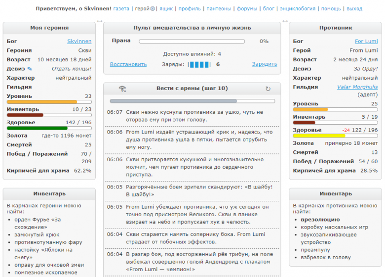Radnja ove pregledničke igre sama po sebi nije. Vi gledate svoje “Tamagočije”, koji se samostalno ili s vašom božanskom pomoći nastoje razviti. On će loviti čudovišta, moliti se i žrtvovati, ponekad se napiti i prodati sve što je pobijedio od svojih suparnika. Ali ne možete samo gledati - junak može biti odgojen, što ga čini "dobrim" ili "lošim". To je, banalno, metak u njega s munjom, ili zalijevanje ljekovitom kišom, na primjer. I možete glasati za njega: pozovite ga da obavlja određene zadatke. Drago mi je što je igra dostupna na svakom računalu koje pokreće preglednik, kao i na pametnim telefonima i tabletima.