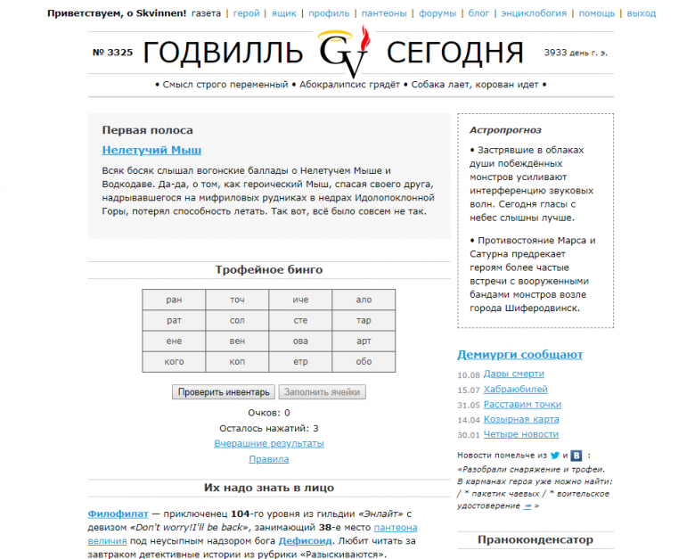 Potpuno tekstualna online igra žanra Zero Playing Game - to jest, ne postoji aktivna akcija za igrača, cijela stvar je u promatranju. No, to je, iako ne najviše mjesto, projekt u potpunosti zaslužio. "Godville" dokazuje da je raspored - nije glavna stvar. Kao sposobnost kontrole junaka. Ovaj projekt će omogućiti pumpanje fantazije, čitanje o dnevnim avanturama njegovog junaka - smiješno i ne tako. Zanimljiva značajka - igra su razvili sami igrači. Sve te smiješne riječi, zanimljive situacije, pa čak i imena trofeja i čudovišta izumili su isti ljudi. A vi također možete nadoknaditi svinjsku banku sadržaja.