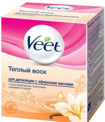 Jedan od najpopularnijih proizvođača alata za depilaciju je brend Veet. Njegova ponuda uključuje topli vosak s eteričnim uljima. Jedna posuda sadrži 250 ml sredstava, dovoljno je za nekoliko postupaka. Komplet također uključuje i posebnu lopaticu za nanošenje i 12 traka koje se mogu koristiti nekoliko puta. Na sječivu je indikator koji pokazuje temperaturu sastava. Proizvođač tvrdi da nakon depilacije s Veet voskom, koža ostaje glatka do mjesec dana. Važna točka - sastav je savršeno ispran s vodom, za razliku od sličnih proizvoda.