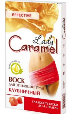 Proizvod ukrajinske proizvodnje iz marke Lady Caramel poznat je na domaćem tržištu zbog njegove pristupačnosti i prihvatljive kvalitete. Uglavnom se koristi kod kuće. Set sadrži vosak u obliku tanjura, 2 maramice za uklanjanje po završetku postupka, kao i 16 jednokratnih traka. Ovaj vosak nije uobičajen način primjene. Prije depilacije, zagrijte ploču u rukama, podijelite je na dva dijela, od kojih bi svaki trebao biti zalijepljen na željeni dio tijela protiv rasta kose, a zatim s oštrim pokretom da odvojite tanjur od kože. Nakon zahvata ne možete navlažiti tretirana područja vodom do 8 sati. Učinak traje u prosjeku 3 tjedna.