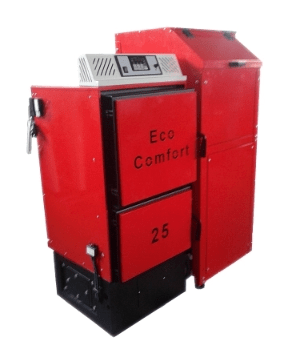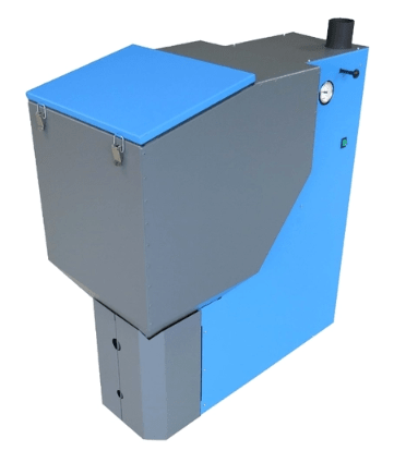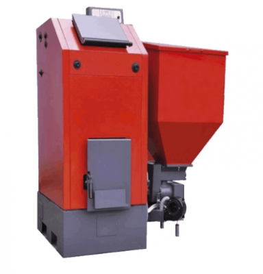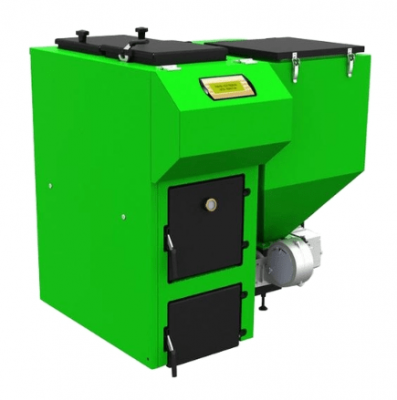 Jednokružni kotao od čelika, čija učinkovitost iznosi 92%. Djeluje uglavnom na pelete, ali ako je potrebno, možete koristiti mali ugljen, a ako imate posebno ugrađene segmente rešetke - drva za ogrjev. Radi na dva načina: ljeti i zimi. U ljetnom režimu, kotao je priključen na kotao kako bi se osigurala topla voda. U zimi - radi na grijanje kuće. Snaga se mijenja prema vlastitom nahođenju. Bunker je velik, može primiti do 220 kg peleta, koji pri maksimalnoj snazi traju 38 sati rada.