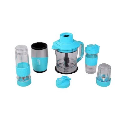 Izrađen u cijelosti od plastike. Ima nekoliko različitih zdjela, što je vrlo povoljno. Set dolazi s glavnim vrčem od 1,2 litre, dvije posude s bočicama sportskih poklopaca (570 i 400 ml), kapacitetom mlaznice od 200 ml. Jer svaki ima svoj nož. Blender se može nazvati univerzalnim - lako je prikladan za pripremu nekoliko koktela jedan za drugim, bez prekidanja čišćenja zdjela. Ali samo u malim količinama - sportske boce su dizajnirane za jednu ili dvije porcije, a veliki vrč - za tri ili četiri. A u recenzijama i recenzijama primijećeno je da se model lako nosi s pripremom mljevenog mesa, brašna, šećera u prahu i tako dalje.