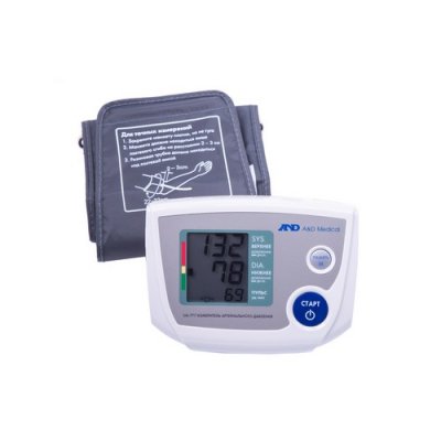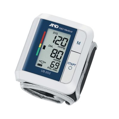 Automatski tonometar AND UB-202 za mjerenje tlaka i pulsa montiran je na ručni zglob. To je mala kompaktna jedinica na manžeti koja radi isključivo na baterijama. Uređaj je opremljen velikim LCD zaslonom u tri retka. Uz indikator aritmije i mjerne pokazatelje, na zaslonu se uvijek prikazuje napunjenost uređaja, što omogućuje zamjenu baterija na vrijeme. Na rubu se nalaze dva gumba: jedan za uključivanje / isključivanje, a drugi - gumb M, koji vam omogućuje pregled najnovijih pokazatelja tlaka i njihove prosječne vrijednosti.