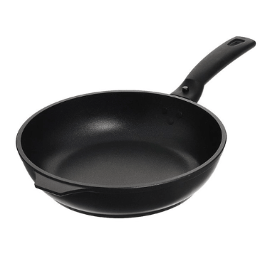 Okrugli aluminijski lončić malog promjera (24 cm). Dno je debelo - 6 mm, zidovi - 4 mm. To osigurava ravnomjerno zagrijavanje, dugo i postupno oslobađanje topline. Posuda je prikladna ne samo za prženje, već i za gašenje i čežnju. Ručica je fiksirana, izrađena od bakelita. Posuda se može strojno prati, ali se ne može koristiti za indukcijsku kuhalicu i pećnicu.